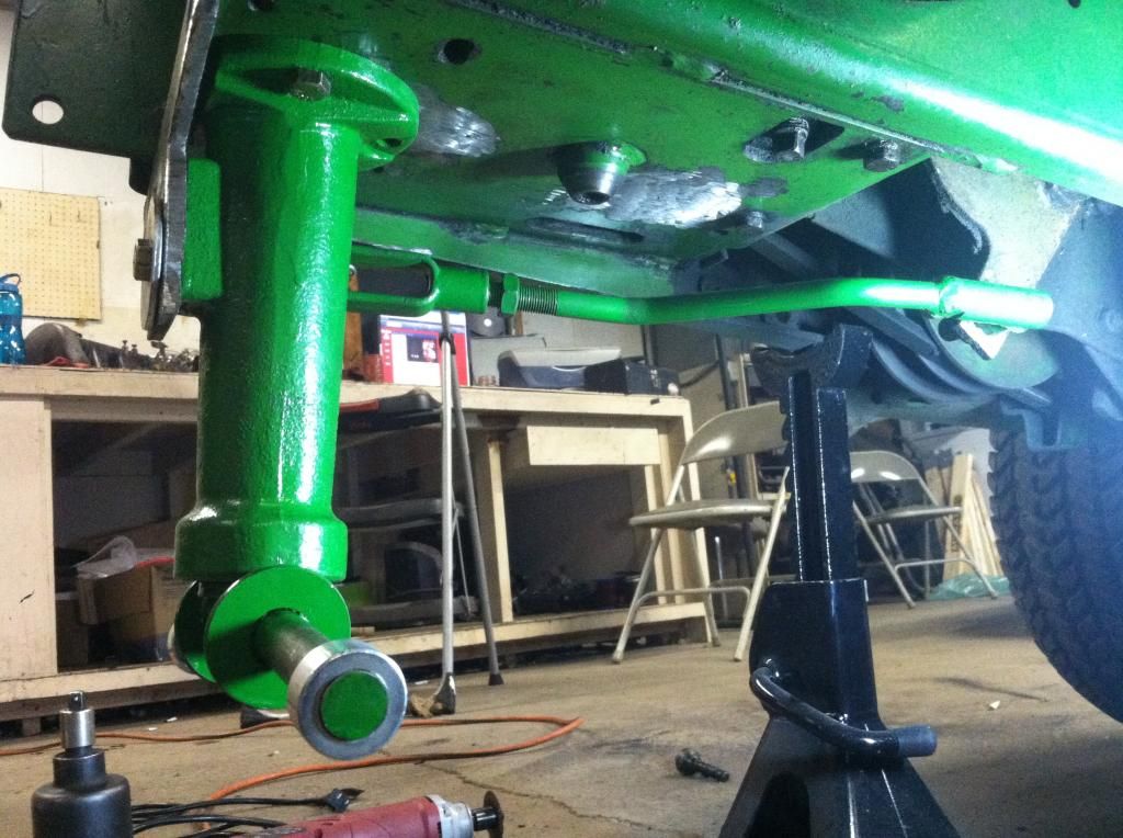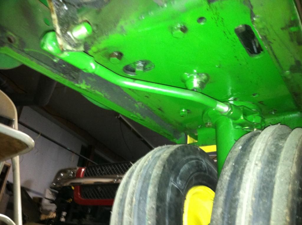 Next from under the tractor remove the steering arm nut that attaches to the steering box. Then remove the large center bolt and nut that goes threw the front axle, and the bolt that goes up threw the center of the steering bracket.